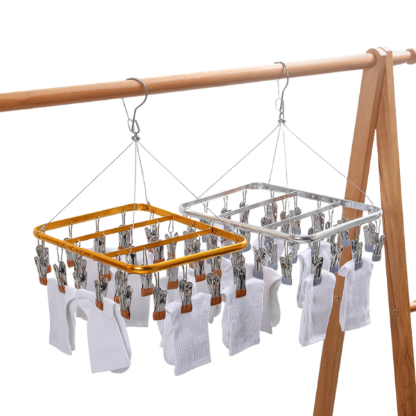 Material: Aluminio + acero inoxidable (antioxidante y duradero) Colores disponibles: Dorado / Plateado Medidas: 33 × 25 × 8 cm (altura total con gancho: 36 cm) Cantidad de clips: 26 unidades Gancho superior giratorio: Permite colgarlo fácilmente en varillas, sogas o soportes Diseño compacto y estable: Ideal para ropa interior, calcetines, toallas pequeñas o prendas delicadas