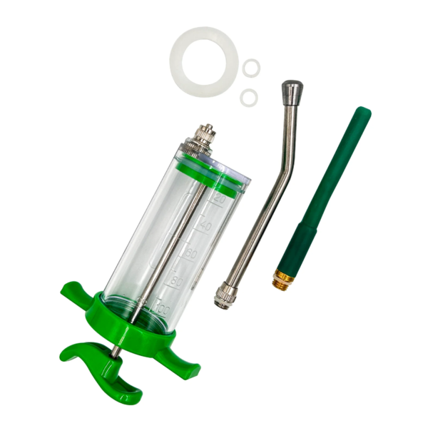 Este kit de jeringa reutilizable TPX de 100ml es una herramienta esencial para la administración precisa de medicamentos en entornos veterinarios. Incluye dos cánulas, cada una diseñada para diferentes tipos de tratamientos: