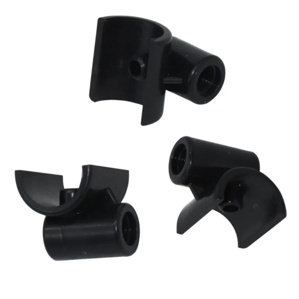 Material: Plástico resistente de alta durabilidad. Color: Negro. Tipo de rosca: Universal, compatible con bebederos automáticos para aves. Diseño ergonómico para fácil instalación en jaulas o tuberías. Soporte en forma de abrazadera para una fijación estable.