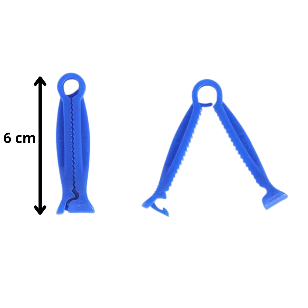 Clips hemostáticos plásticos de 6 cm, diseñados para sujetar y asegurar el cordón umbilical en lechones, terneros y animales recién nacidos. Su estructura firme garantiza un cierre seguro, reduciendo el riesgo de infecciones y sangrado. Fabricados en plástico resistente, ligeros, limpios y descartables.