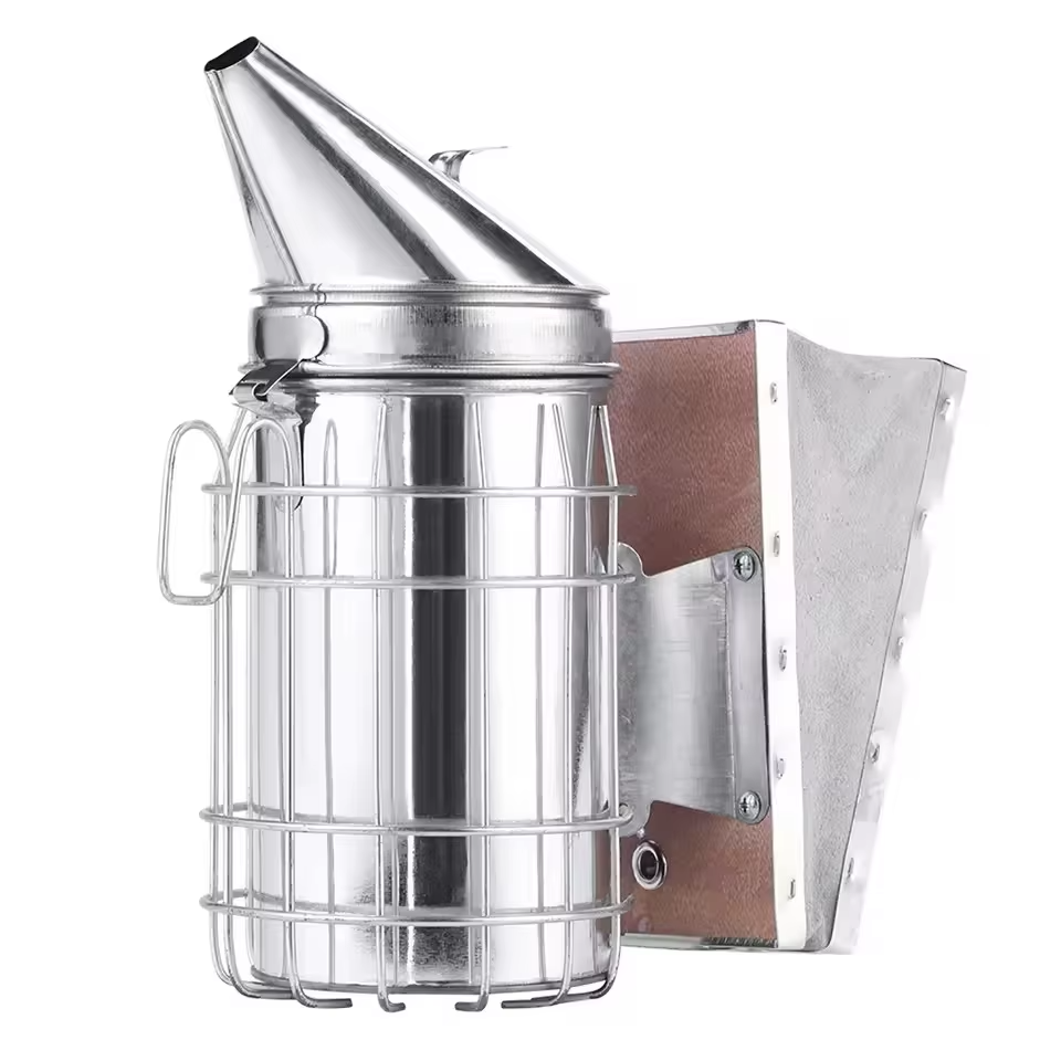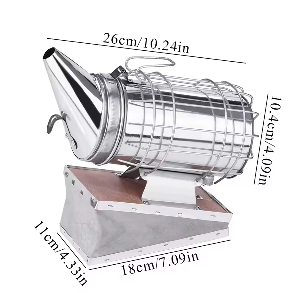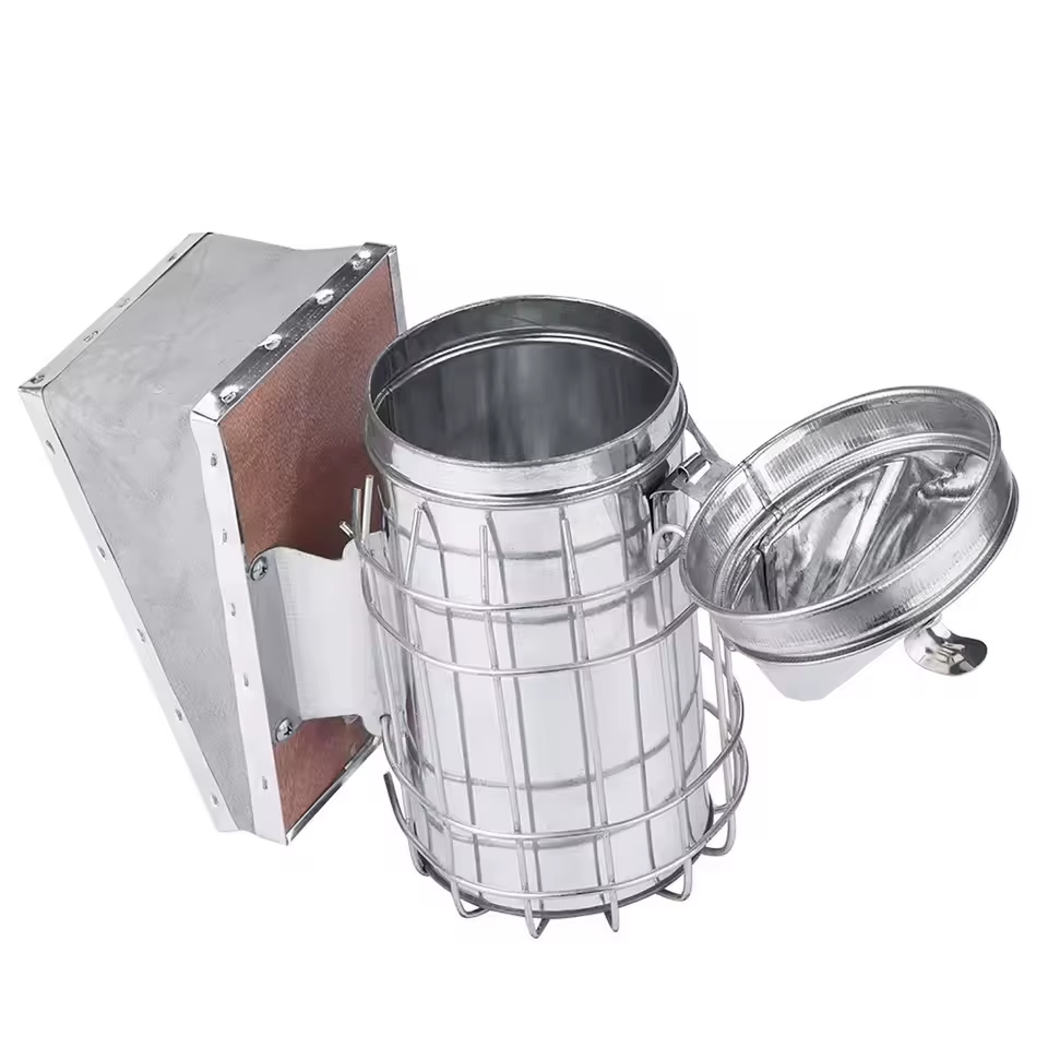 Ahumador profesional fabricado en acero inoxidable resistente, diseñado para calmar a las abejas durante la inspección o cosecha de miel. Es una herramienta indispensable en la apicultura, ya que permite trabajar con seguridad y sin causar daño al enjambre.