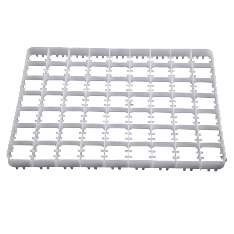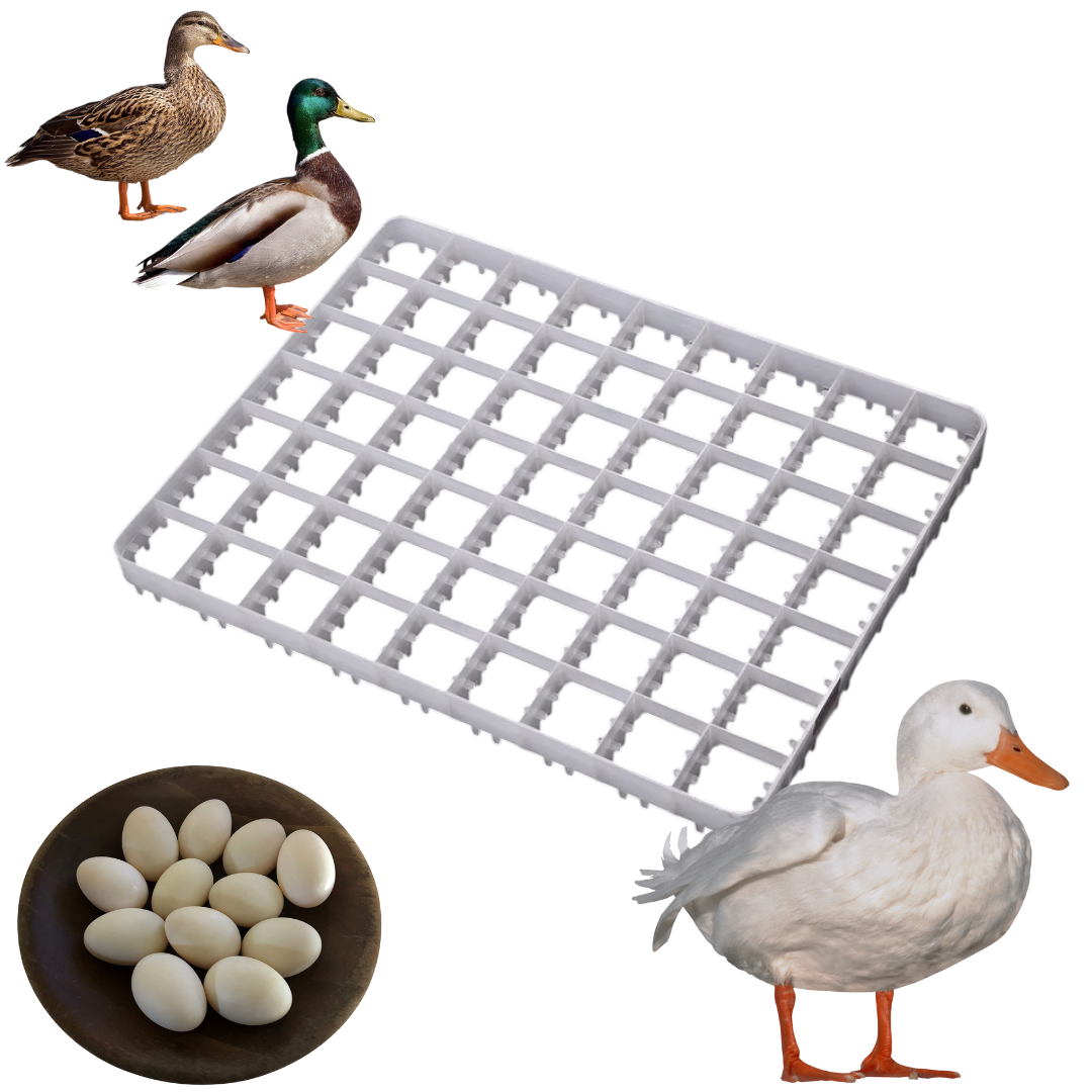 Bandeja plástica para incubadora, especialmente diseñada para huevos grandes como los de ganso. Su estructura reforzada permite colocar hasta 63 huevos de pato de forma segura y estable.