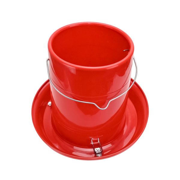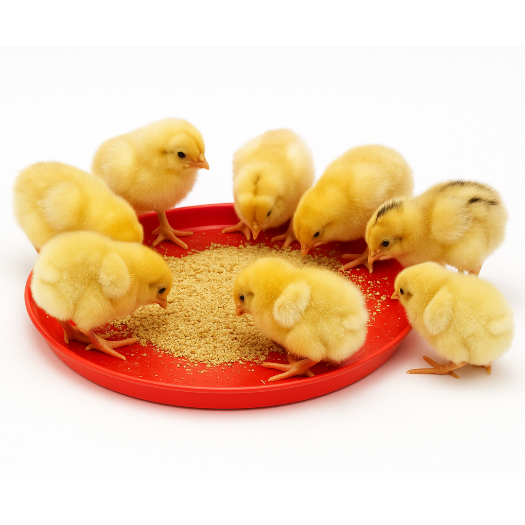 Comedero diseñado especialmente para los primeros días de crianza de pollitos. Su forma plana permite que muchas aves coman al mismo tiempo, favoreciendo el desarrollo uniforme y evitando peleas por alimento.