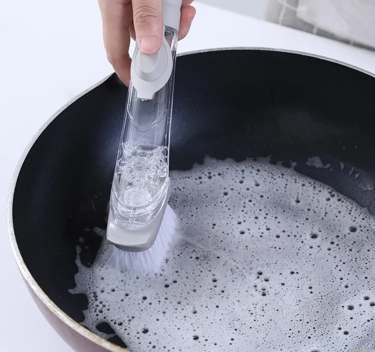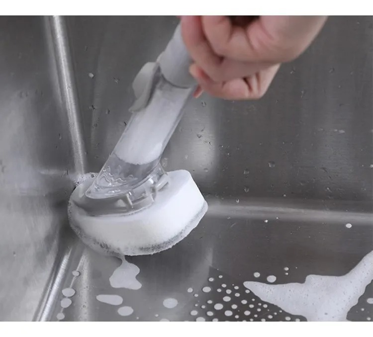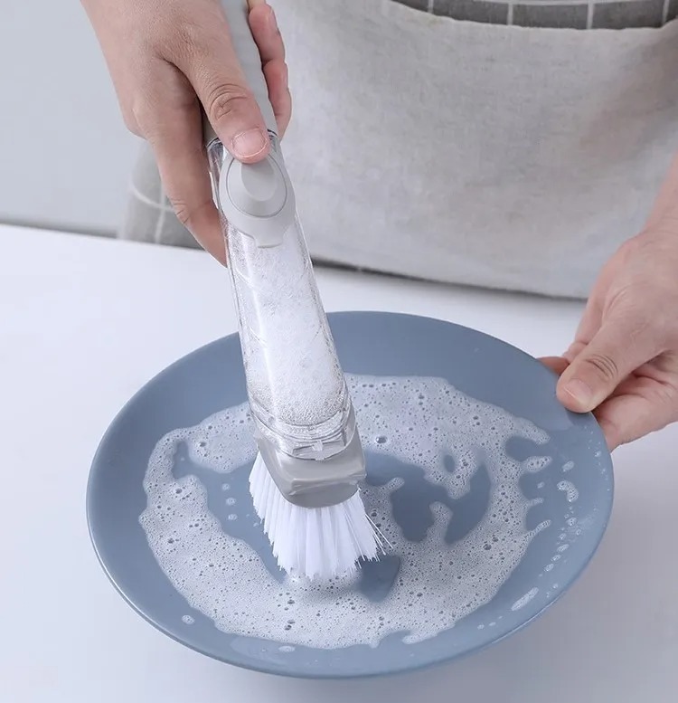 Dispensador de jabón: el cepillo de cocina está equipado con un dispensador de 50ML de gran capacidad y dispensa jabón a petición con solo pulsar un botón. No importa cómo colocarlo, la válvula de silicona puede evitar que el jabón de platos se filtre.