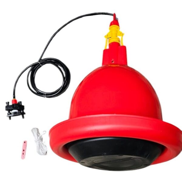 Bebedero automático tipo campana para aves. Incluye válvula, manguera y accesorios. Ideal para gallinas y pollos. Fácil de instalar.