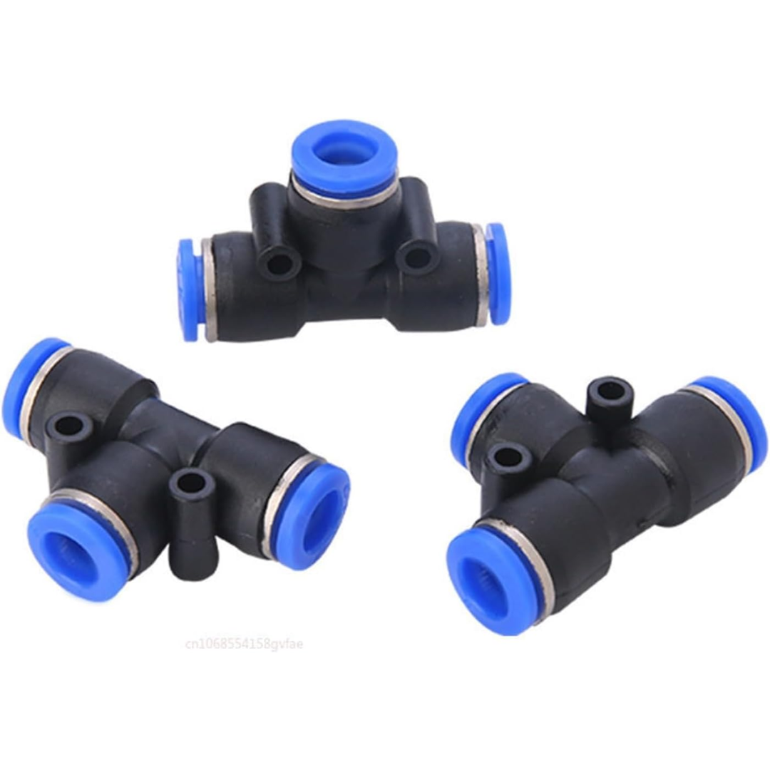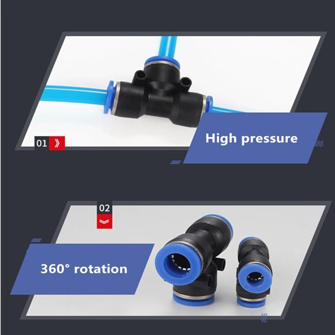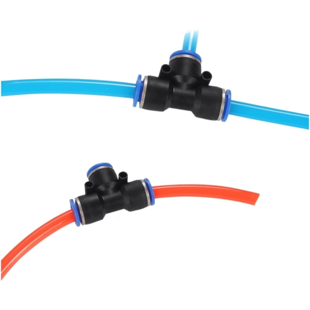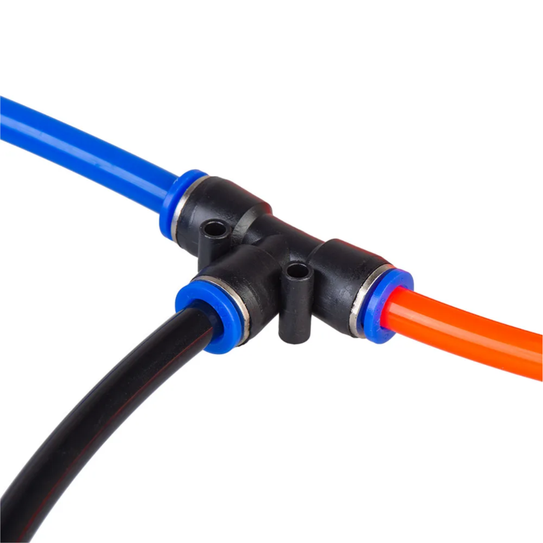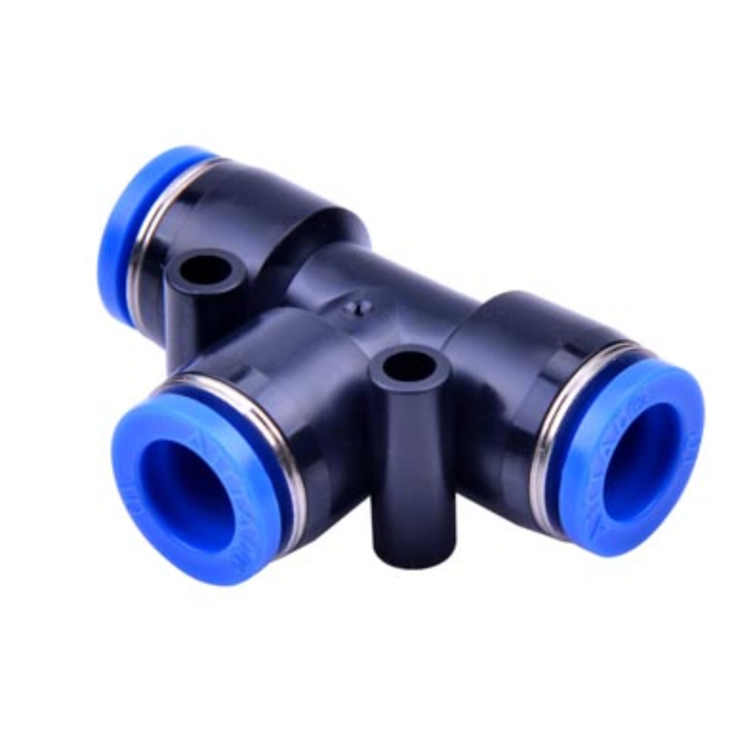 Conector rápido tipo T diseñado para la distribución de aire o fluidos en sistemas neumáticos y líneas de conducción. Permite realizar derivaciones de manera segura, rápida y sin herramientas, ideal para aplicaciones industriales, agrícolas y ganaderas.