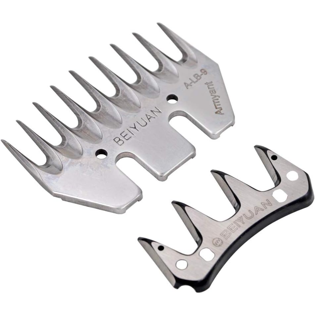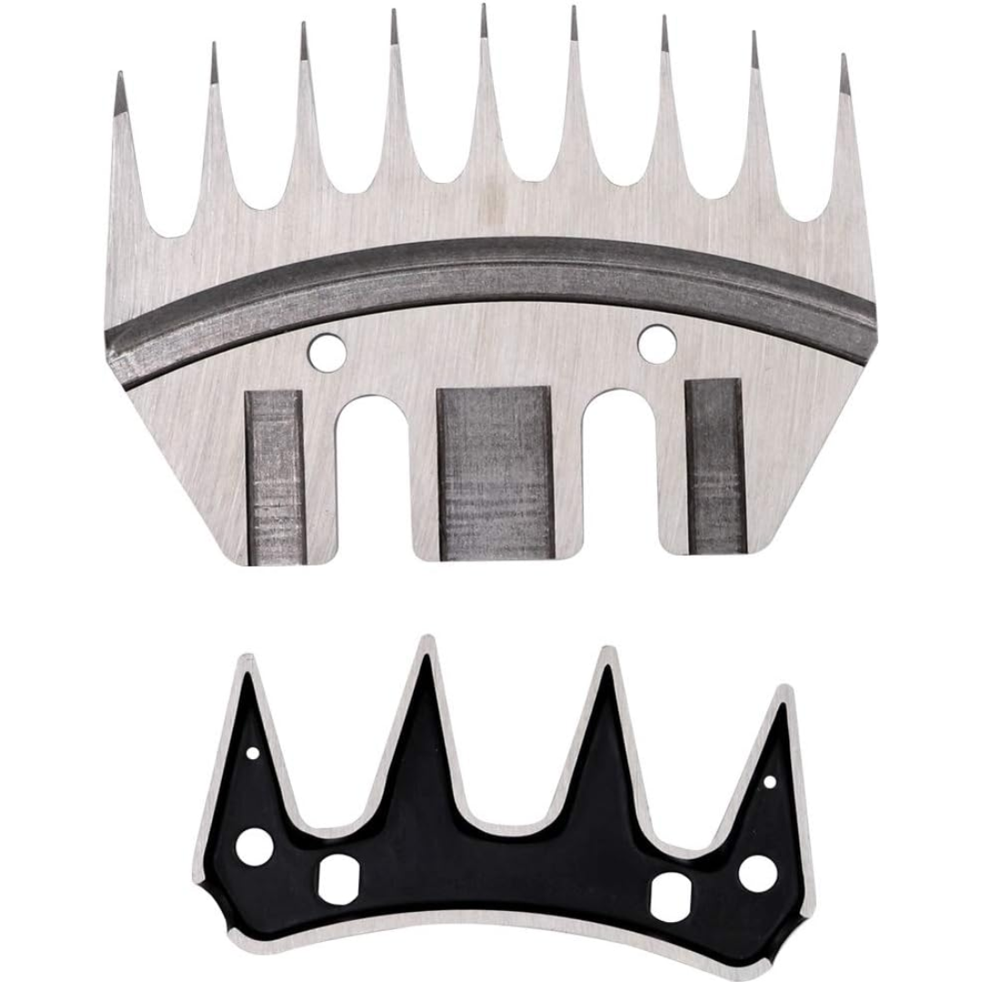 Juego de cuchillas para esquiladora fabricadas en acero inoxidable, diseñadas para ofrecer corte preciso, suave y uniforme durante el proceso de esquila. Ideales para trabajos continuos en ovinos y camélidos, reduciendo el esfuerzo del operario y el estrés del animal.