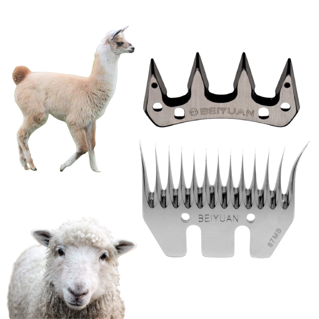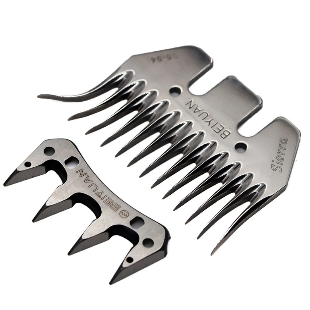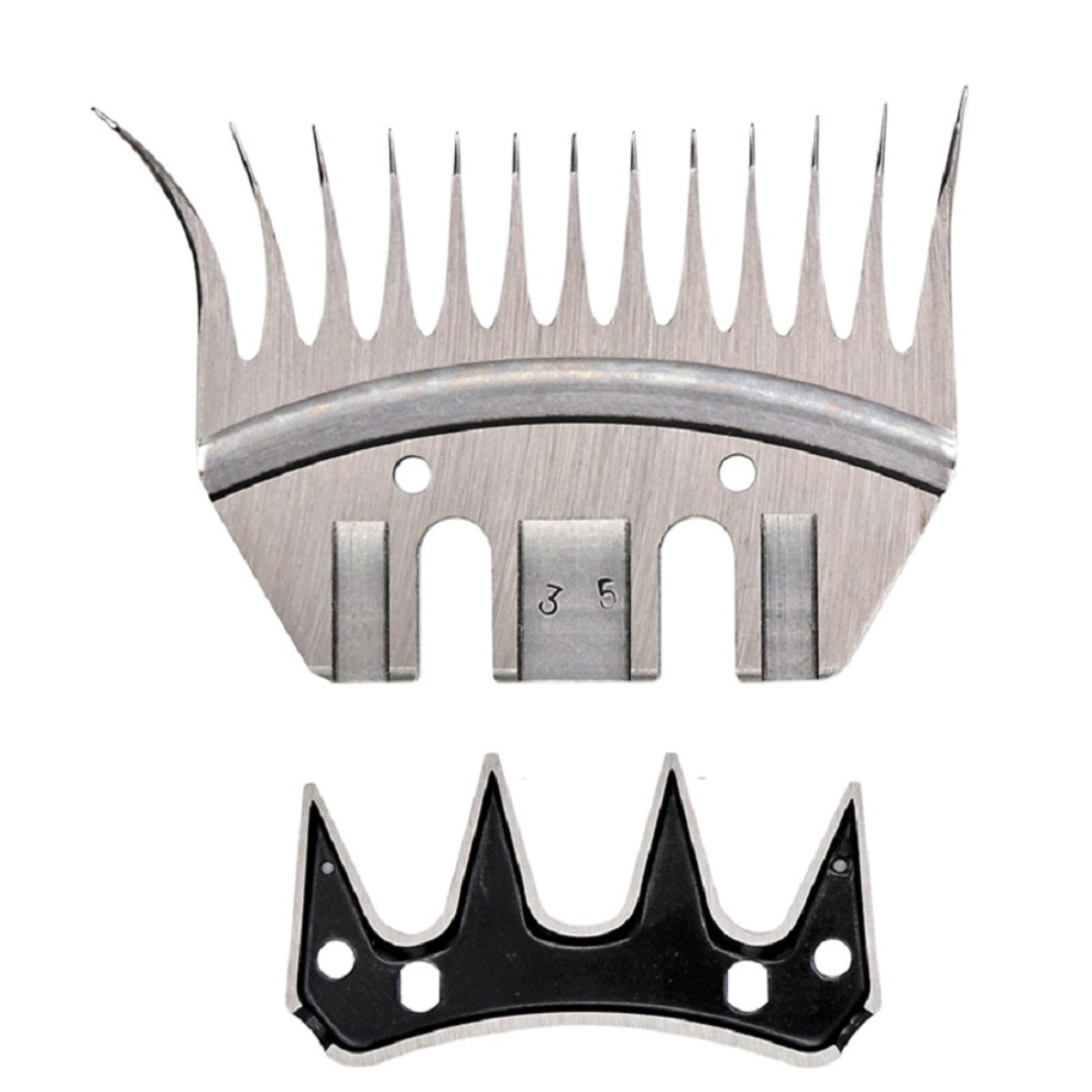 Juego de cuchillas para esquiladora fabricadas en acero inoxidable, modelo de 13 dientes con puntas curvadas, diseñado para brindar un corte más suave, controlado y de mejor acabado durante la esquila.