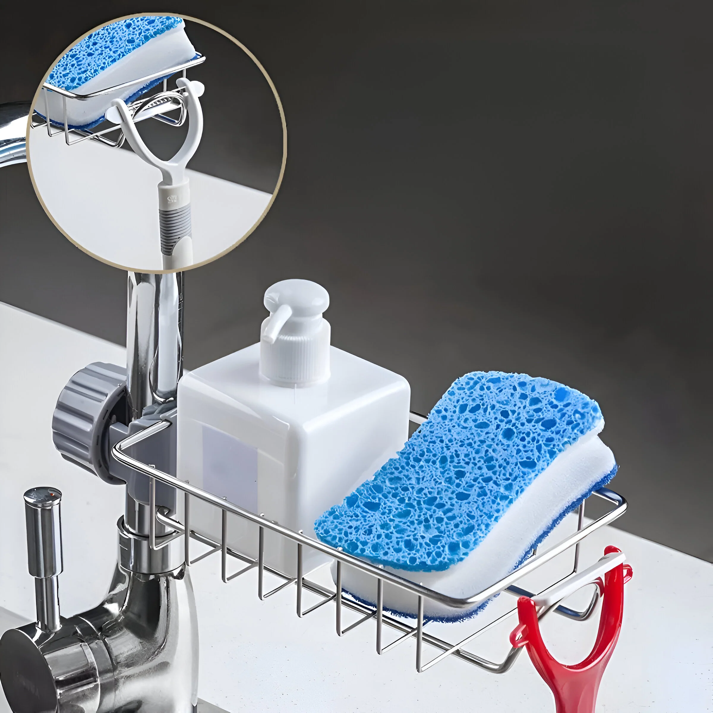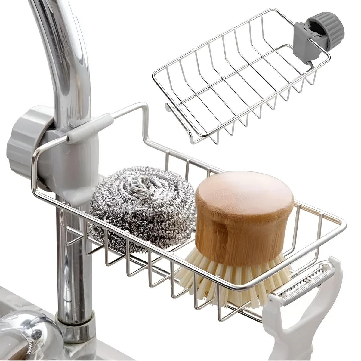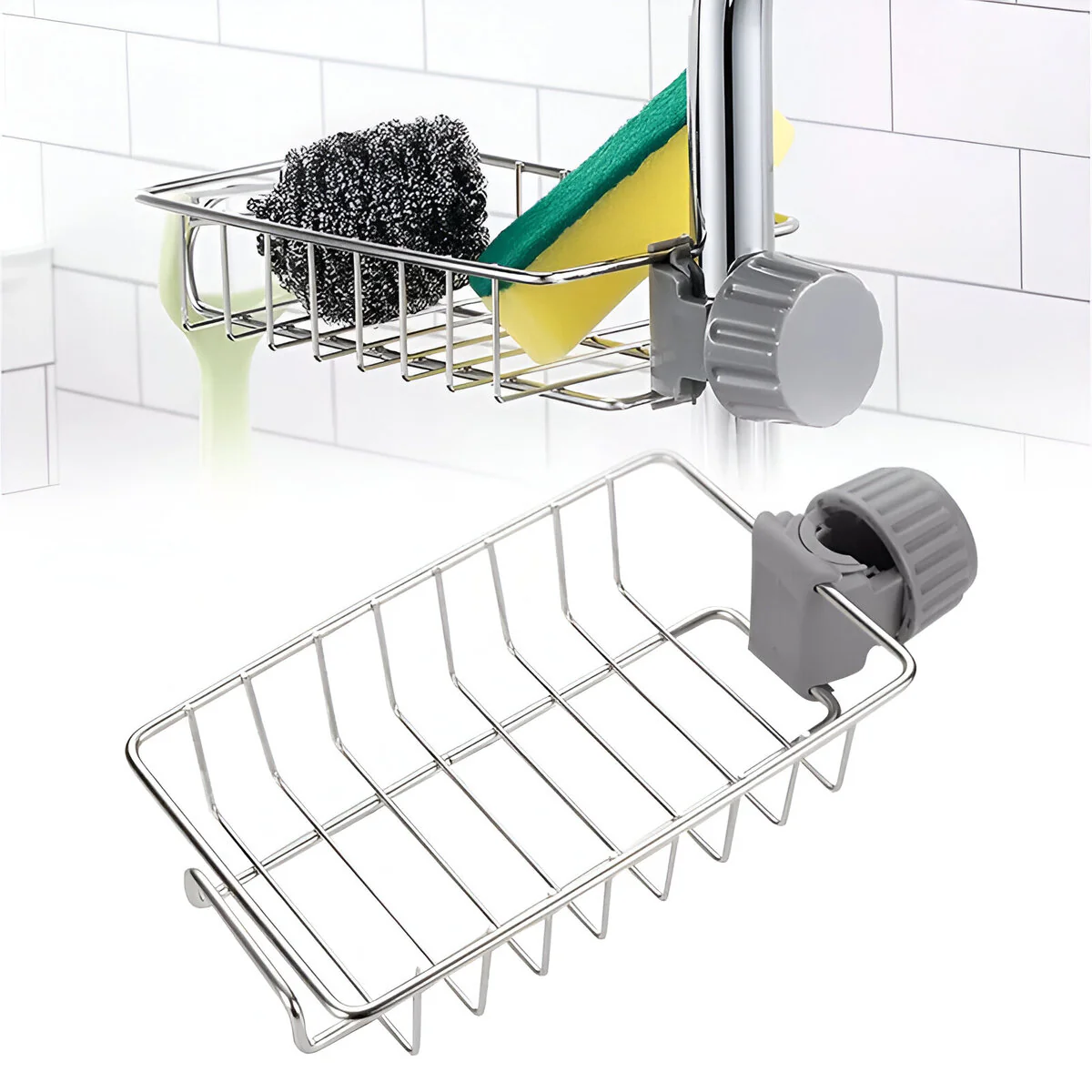 Organizador práctico y resistente, ideal para mantener el área del fregadero limpia y ordenada. Fabricado en acero inoxidable de alta calidad, resistente a la humedad y a la corrosión, con sujeción ajustable que permite instalarlo fácilmente sin necesidad de perforar.