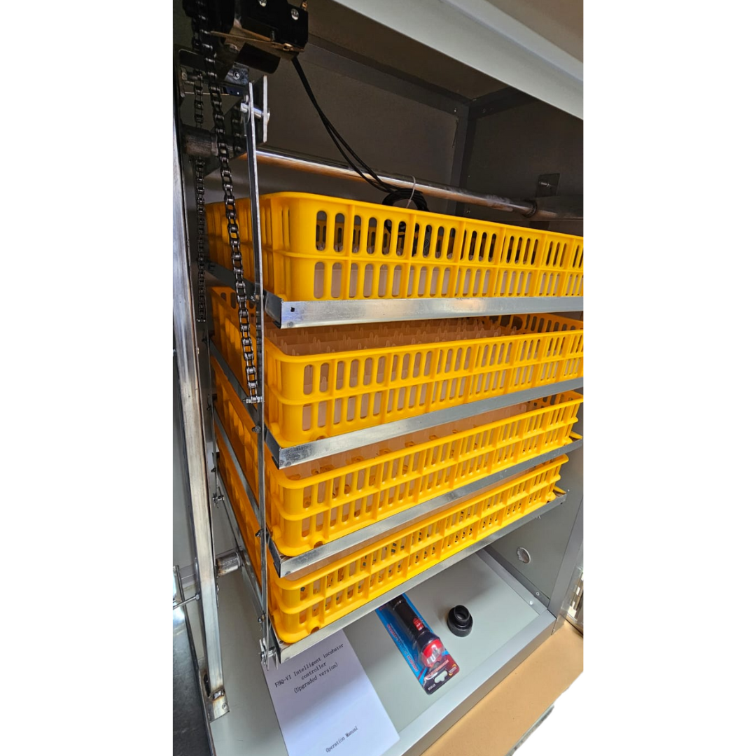 Volteo automático con motor y cadena de acero, garantiza el giro uniforme de los huevos.