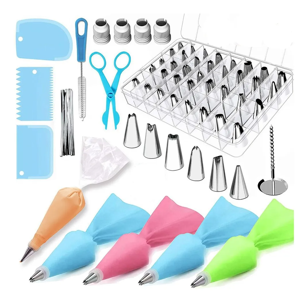 Completo set de repostería con 62 piezas en total, ideal para decorar tortas, cupcakes, galletas y postres con resultados profesionales.