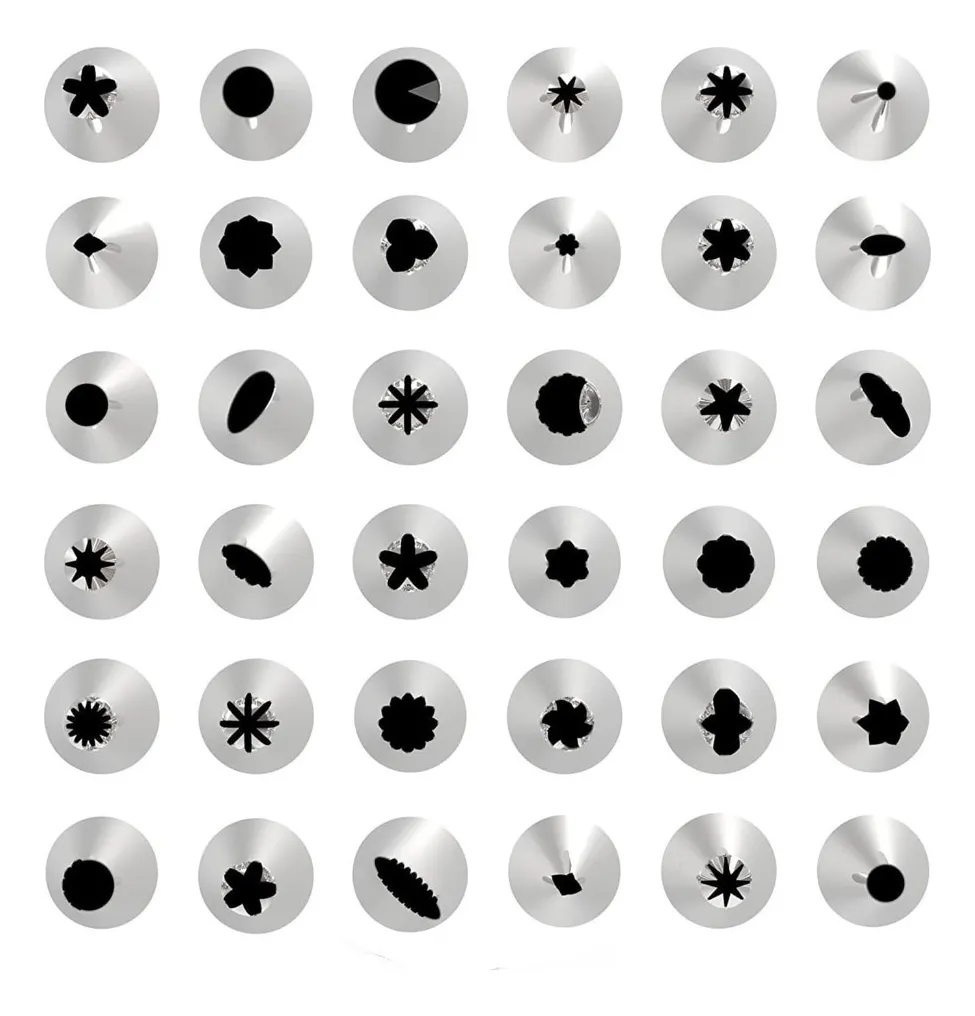 36 boquillas pequeñas de acero inoxidable para diseños finos y precisos.