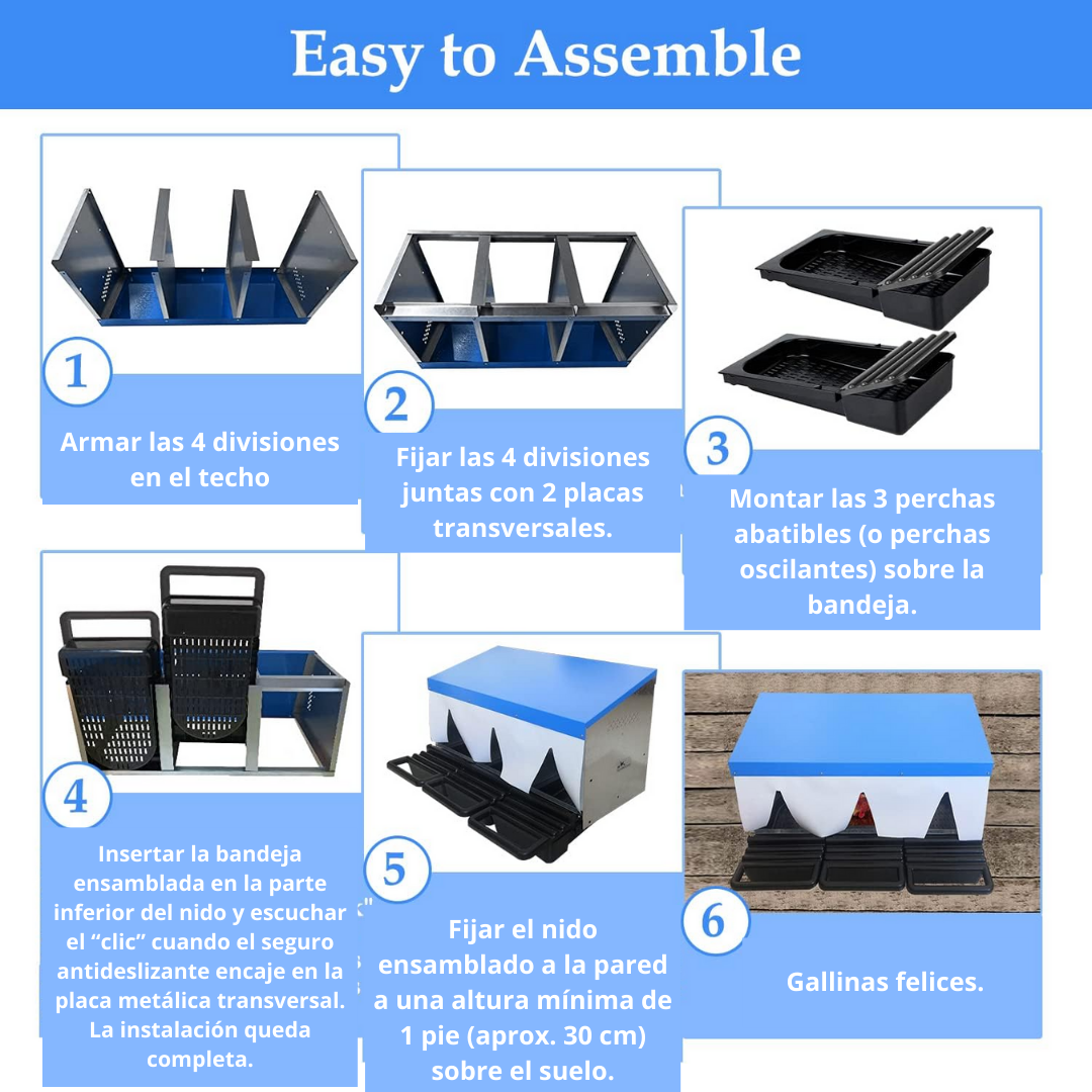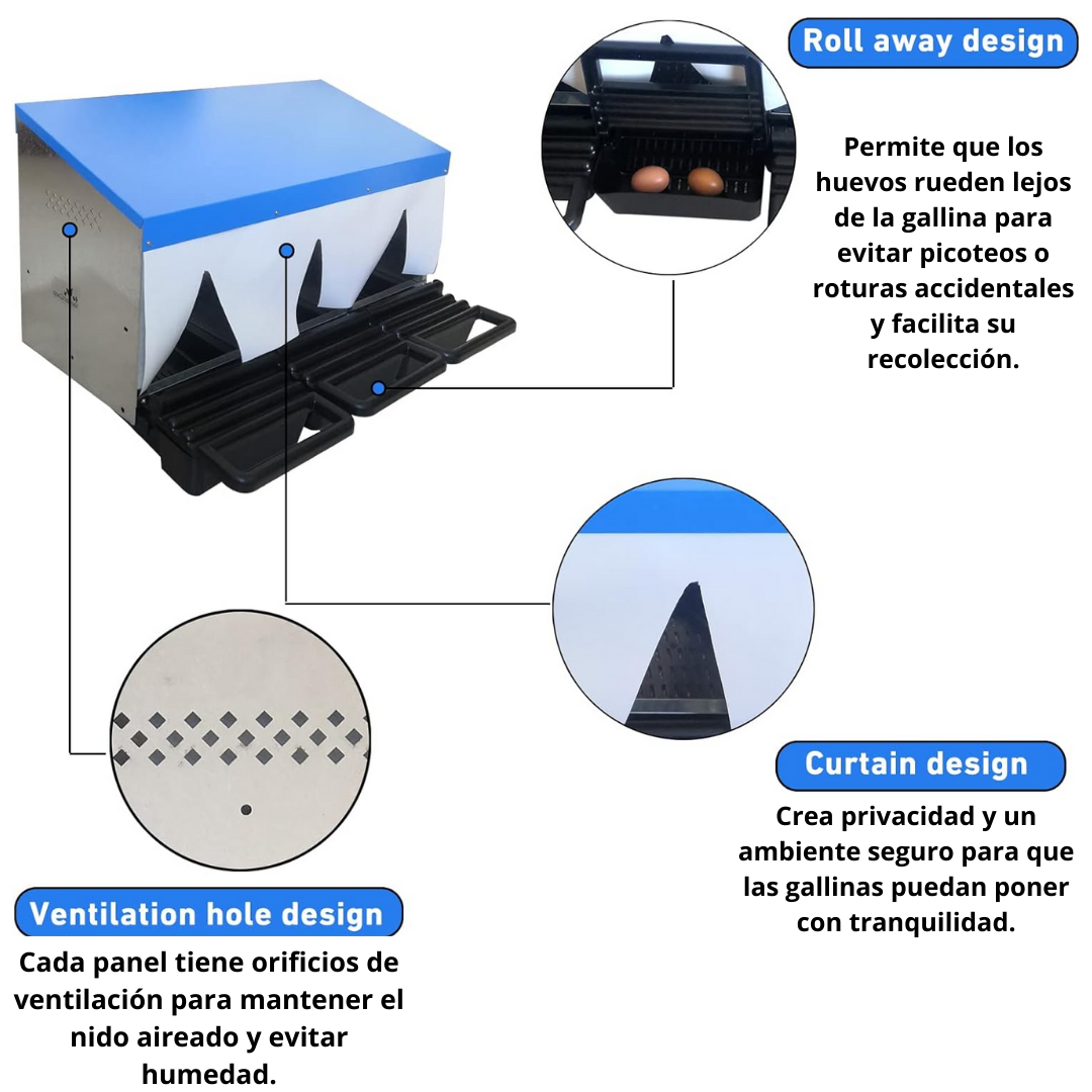Diseñado para mejorar la higiene, facilitar la recolección de huevos y brindar comodidad a las gallinas al momento de poner. Ideal para granjas, galpones, criaderos y producción avícola intensiva. Permite que los huevos rueden automáticamente hacia la bandeja, evitando roturas y picoteos.