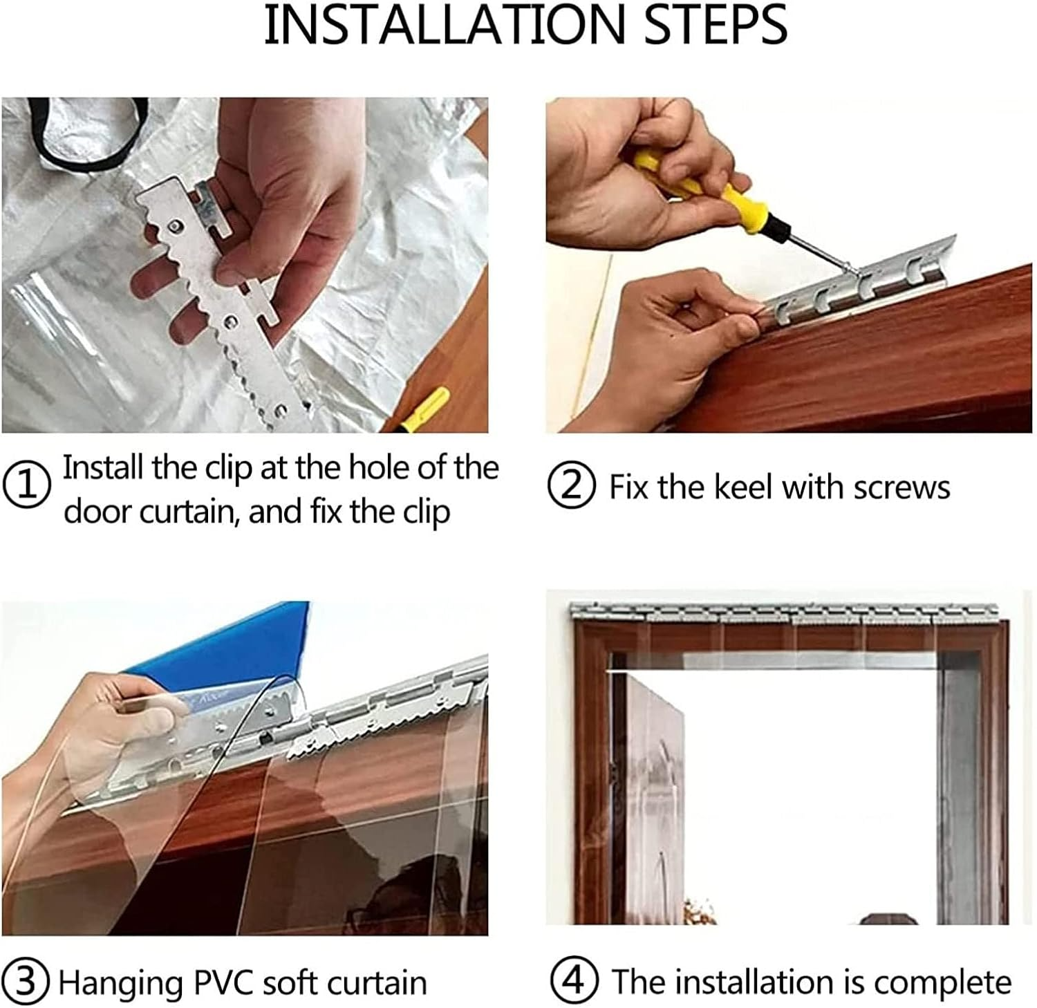 Incluye cortinas de PVC en tiras de 20 cm de ancho, riel metálico de 150 cm y sus clips metálicos de fijación, ofreciendo una solución lista para instalar, resistente y funcional.