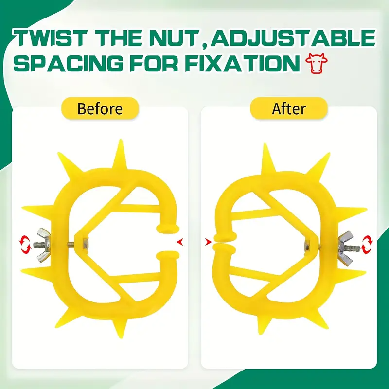 Destetador bovino fabricado en plástico resistente, diseñado para interrumpir el amamantamiento en terneros sin causar daño a la vaca ni al animal. Su diseño con púas y tornillo ajustable evita que el ternero pueda acercarse a la ubre, facilitando el proceso de destete de manera práctica y segura.
