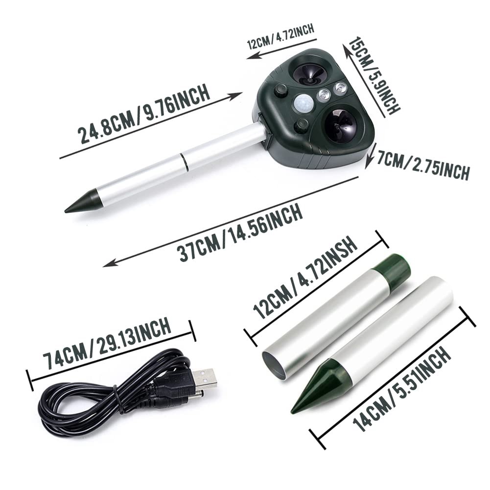 El repelente de pájaros ultrasónico es detectado por el sensor PIR y puede activarse automáticamente por la noche. Cuando las plagas ingresan al área, los LED parpadean y suena una alarma para ahuyentar a los animales.