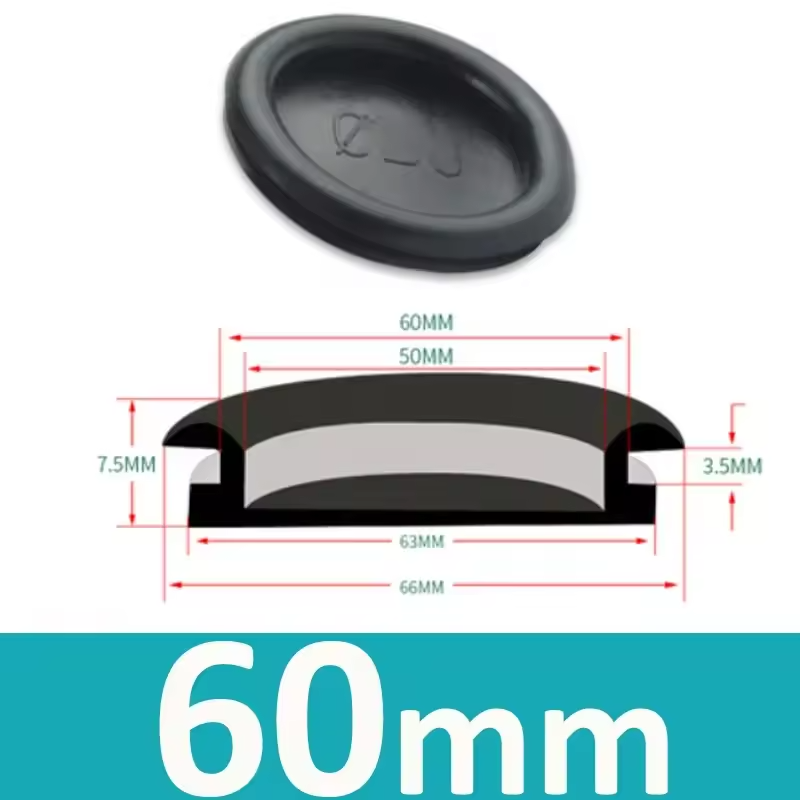 Tapón de goma flexible diseñado para sellar orificios circulares de aproximadamente 60 mm. Ideal para cubrir perforaciones, proteger entradas de polvo y brindar un acabado limpio en estructuras metálicas, incubadoras, gabinetes eléctricos y equipos industriales.