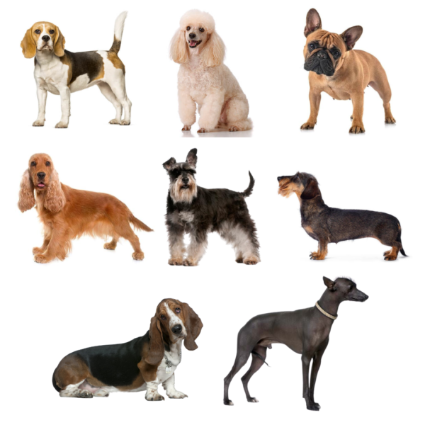 Beagle pequeño – Poodle mediano – Bulldog Francés – Cocker Spaniel chico – Schnauzer mini o mediano – Dachshund – Basset pequeño – Perro peruano joven – Mestizo mediano de hasta 12 kg.